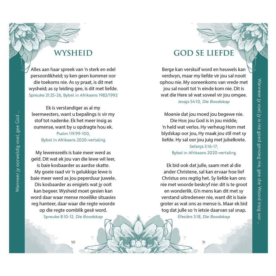 Beloftes van God vir ma’s is ’n versameling bemoedigende beloftes uit die Bybel spesiaal vir ma’s om jou te inspireer, wysheid te gee en te verseker van God se teenwoordigheid. Die 30 temas in hierdie tweekleur-geskenkboekie sal jou lei in tye wanneer jy wonder wat die beste vir jou gesin is, wanneer jy oorweldig voel of wanneer jy bekommerd voel.