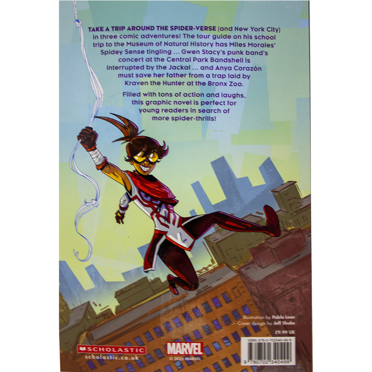 In three comic adventures! The tour guide on his school trip to the Museum of Natural History has Miles Morales Spidey Sense tingling ... Gwen Stacey's punk band's concert at the Central Park Bandshell is interrupted by the Jackal ... and Anya Corazon must save her father from a trap laid by Kraven the Hunter at the Bronx Zoo.