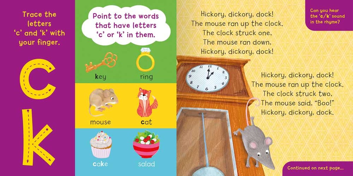 Enjoy the repetition of well-loved nursery rhymes and help your child begin to recognise the letter shapes and sounds of: m d g c/k o e